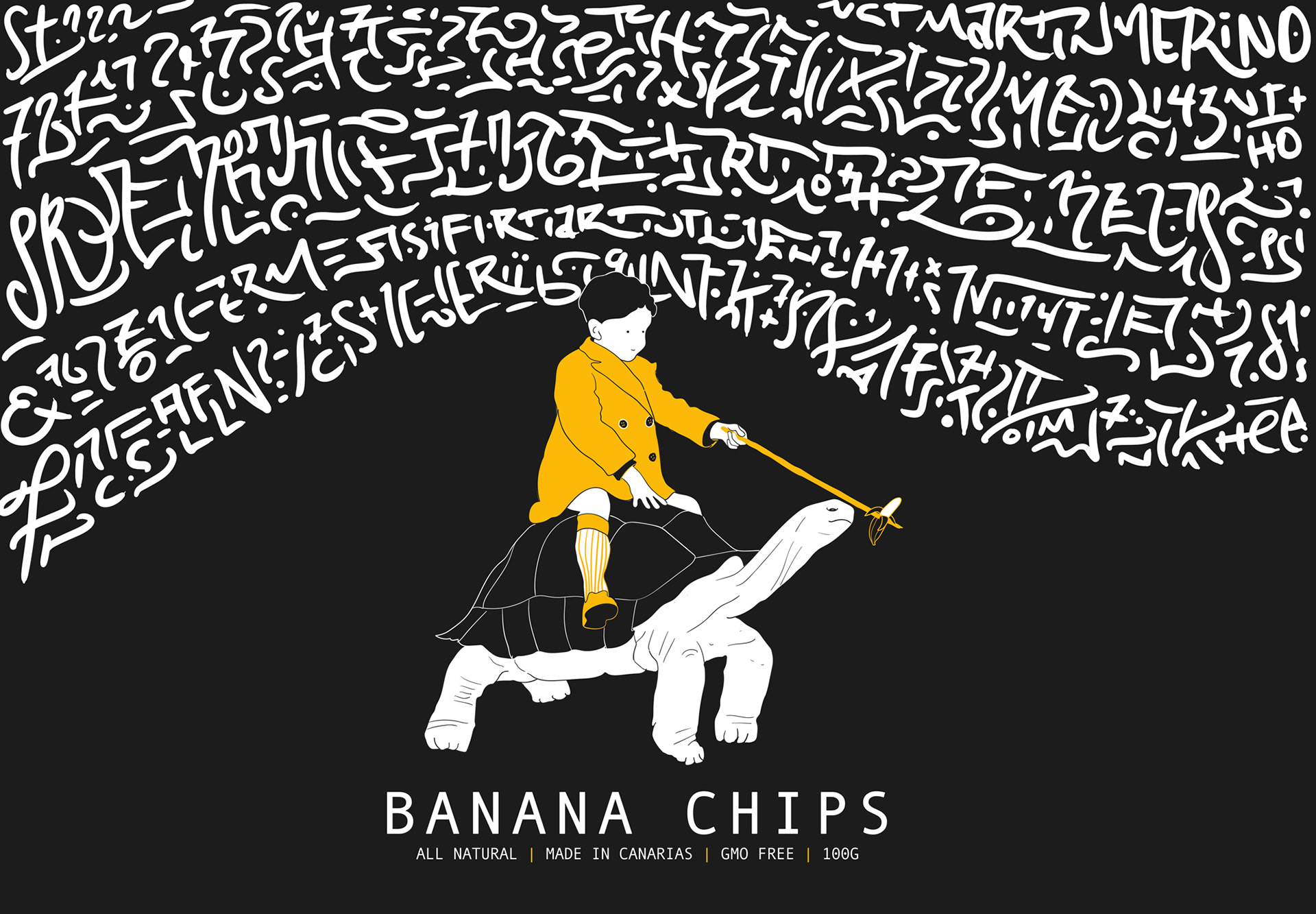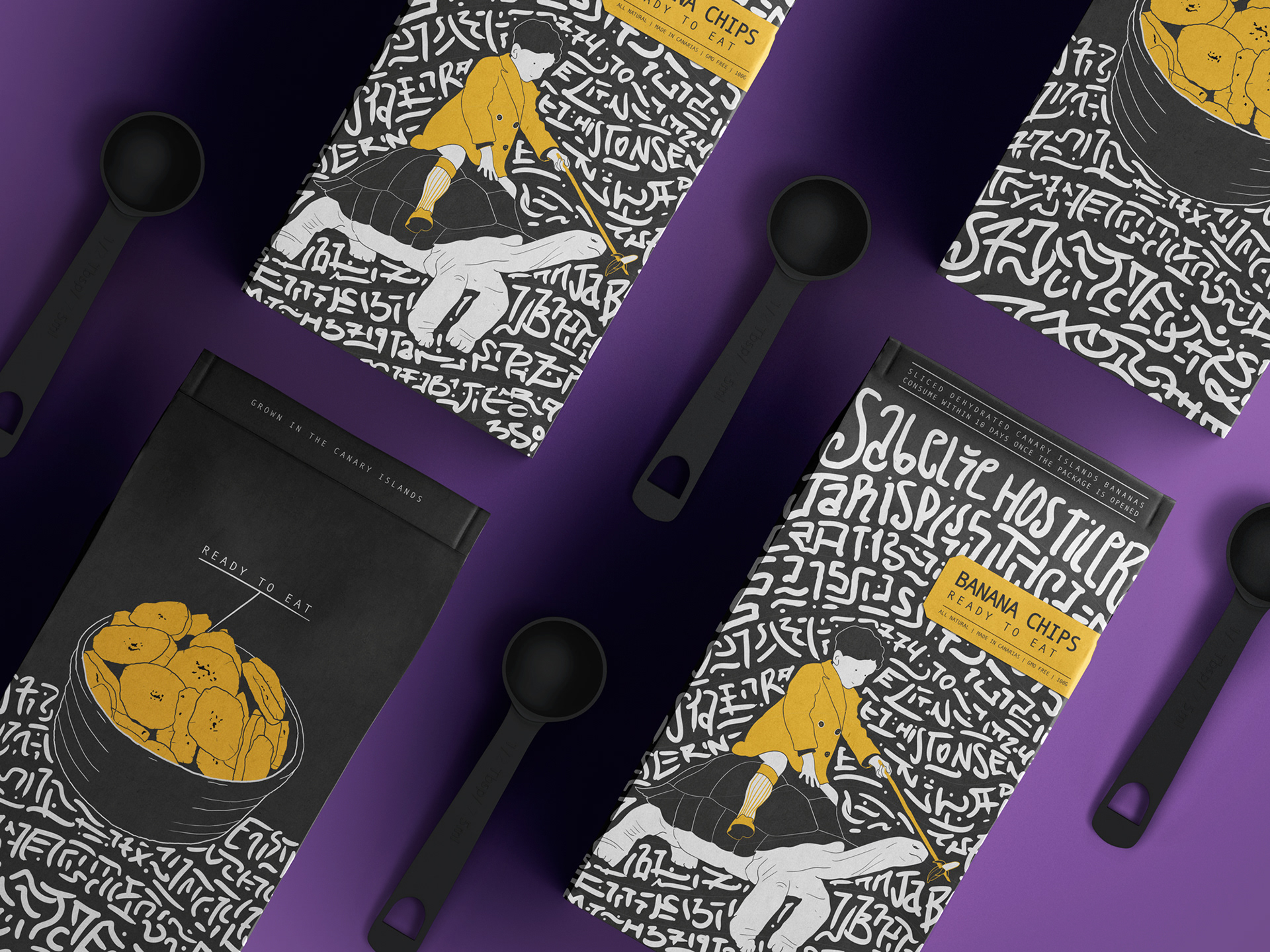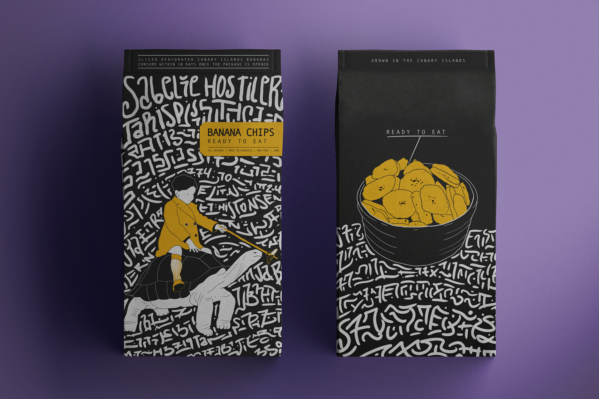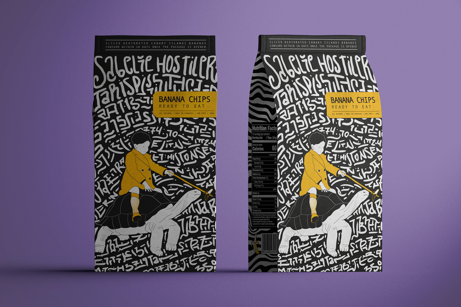 The inspiration behind this design is the need to tell the story of a turtle carrying a child on its back while introducing them to a Canary Island banana. The entire packaging is designed using just two colors, black and yellow, with white serving as the transparent color of the container. These three colors form the basis of the entire design.