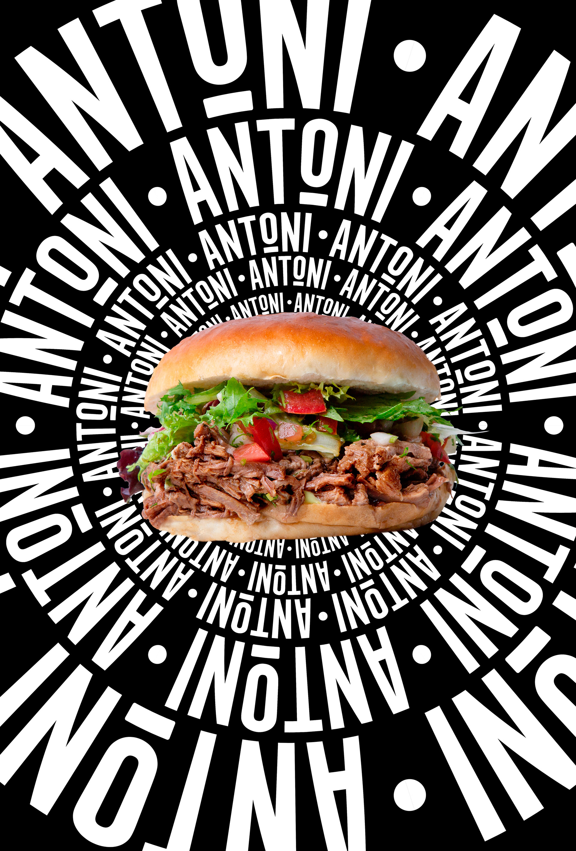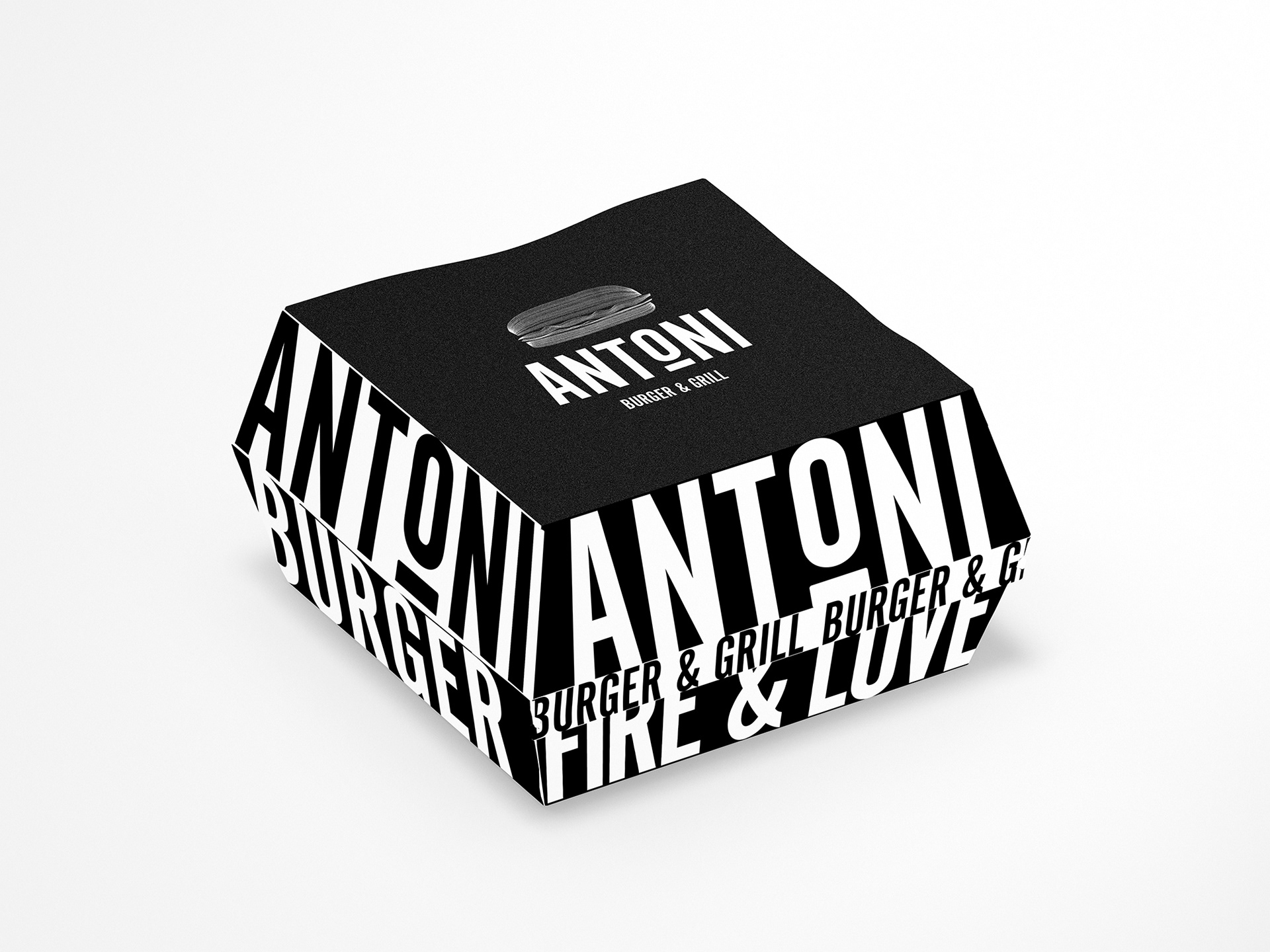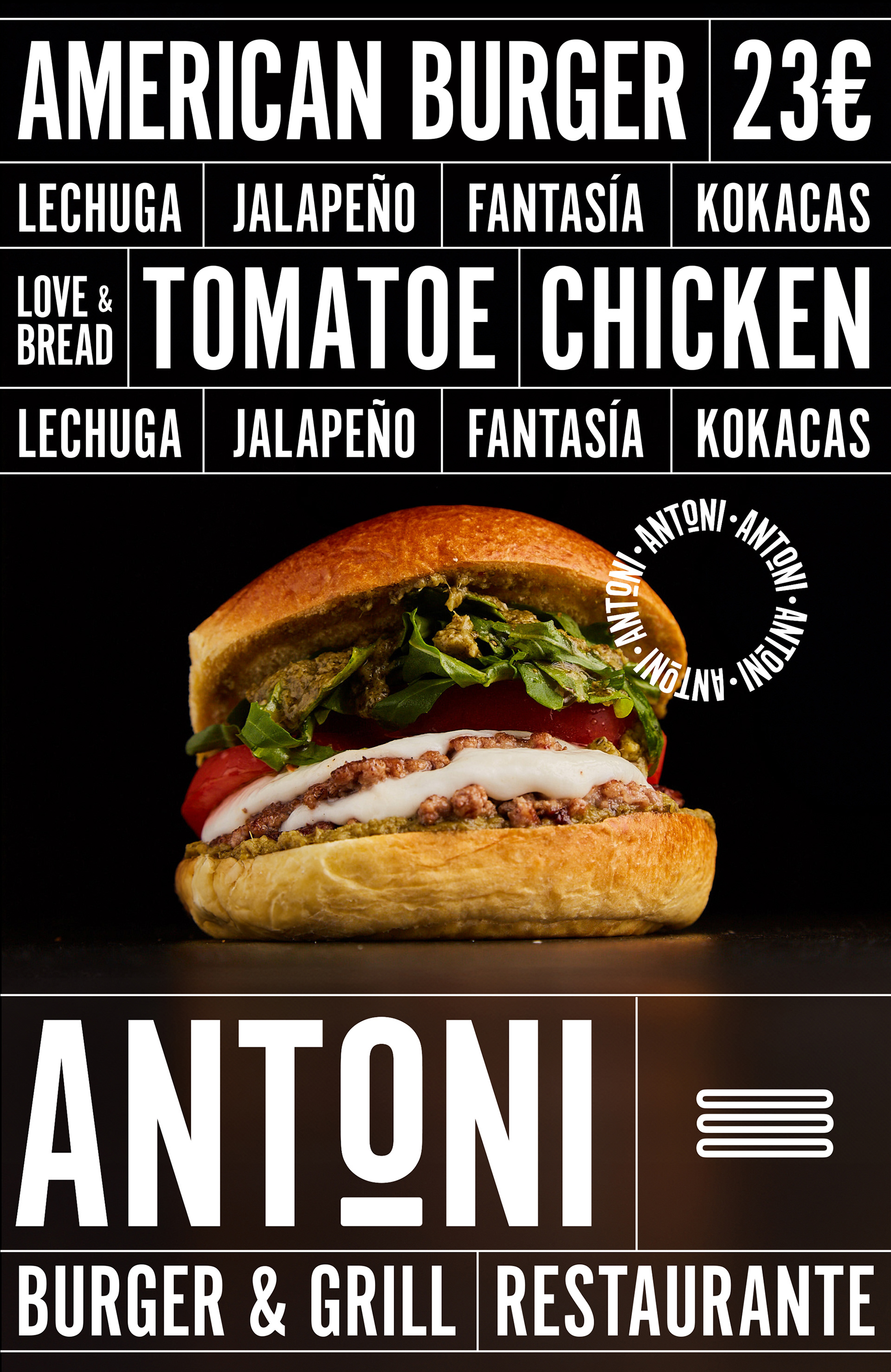 Branding design for a Madrid-inspired grill and burger joint named 'Antoni'