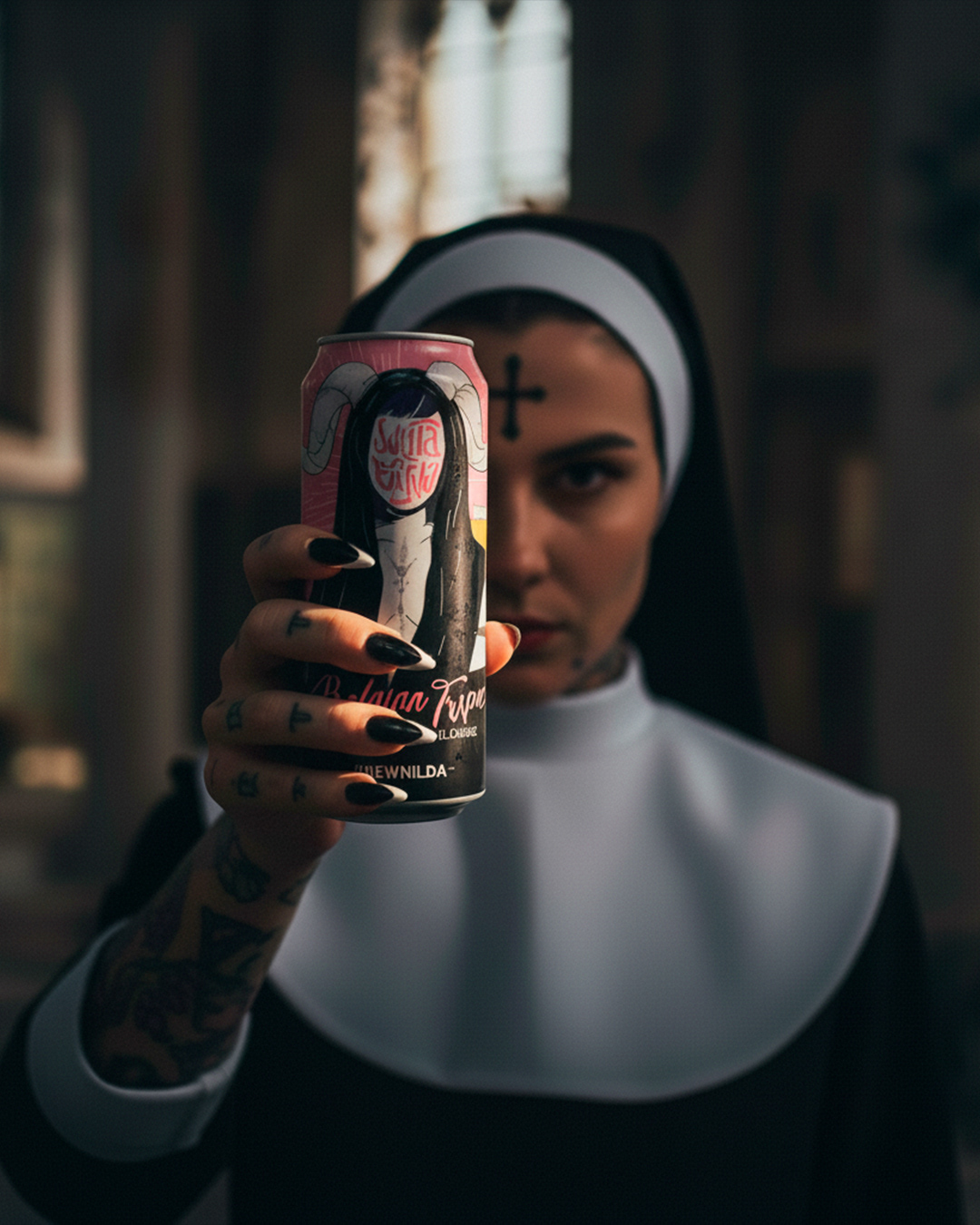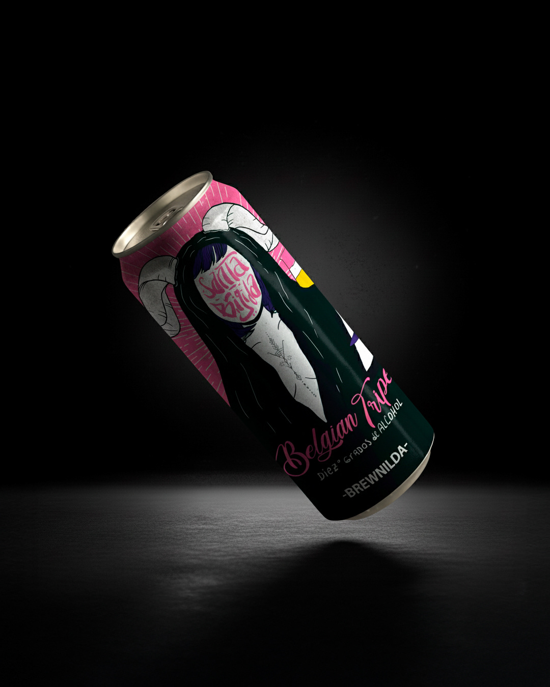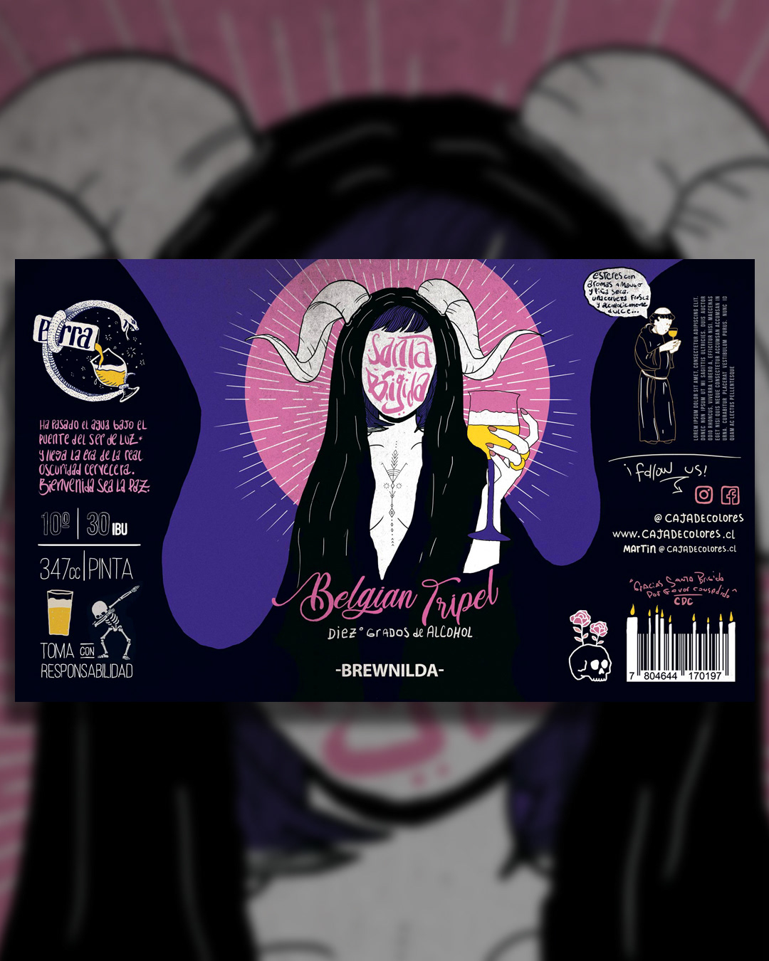Packaging design for a Belgian beer named "Santa Brigida," which translates to "Santa Violenta" in Spanish, alluding to its robust alcohol content of 10 degrees, a characteristic of typical Belgian beers. The design is entirely handcrafted.