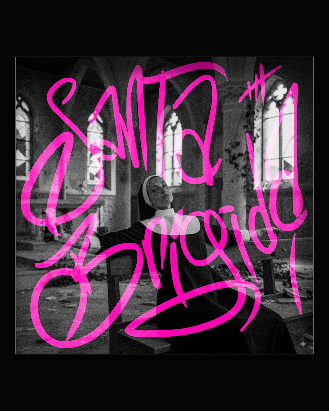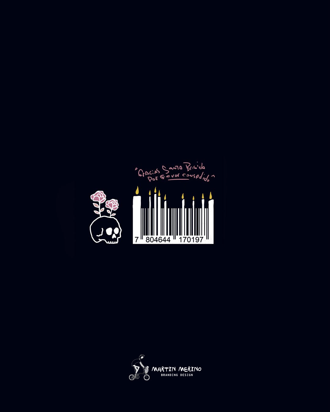 The design concept integrates elements from the Catholic religion, reimagined with a playful style, while also incorporating elements associated with witchcraft. Take note of the barcode detail, which simulates a funerary atmosphere.